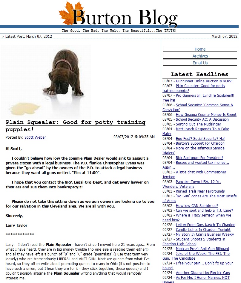 But that apparently hasn't improved their spirits. On February 11, pro-gun activist Rob Luke of Barbaroo, Wisconsin posted a doctored photo of Jeri superimposed on a Playboy magazine cover at the "WAVE Lies" page. Pro-gunner Grant Guess of Racine Wisconsin—who fancies himself a "Defender of Truth, Justice and The American Way," jumped in and commented, "That cannot be Jeri...she is far fuglier than that in any pic I've seen of her. Brrrrrrrrrrr." John S. Whittemore, a member of the U.S. Army at Fort Sill, agreed, writing, "OMG, that is one fugly bitch!"